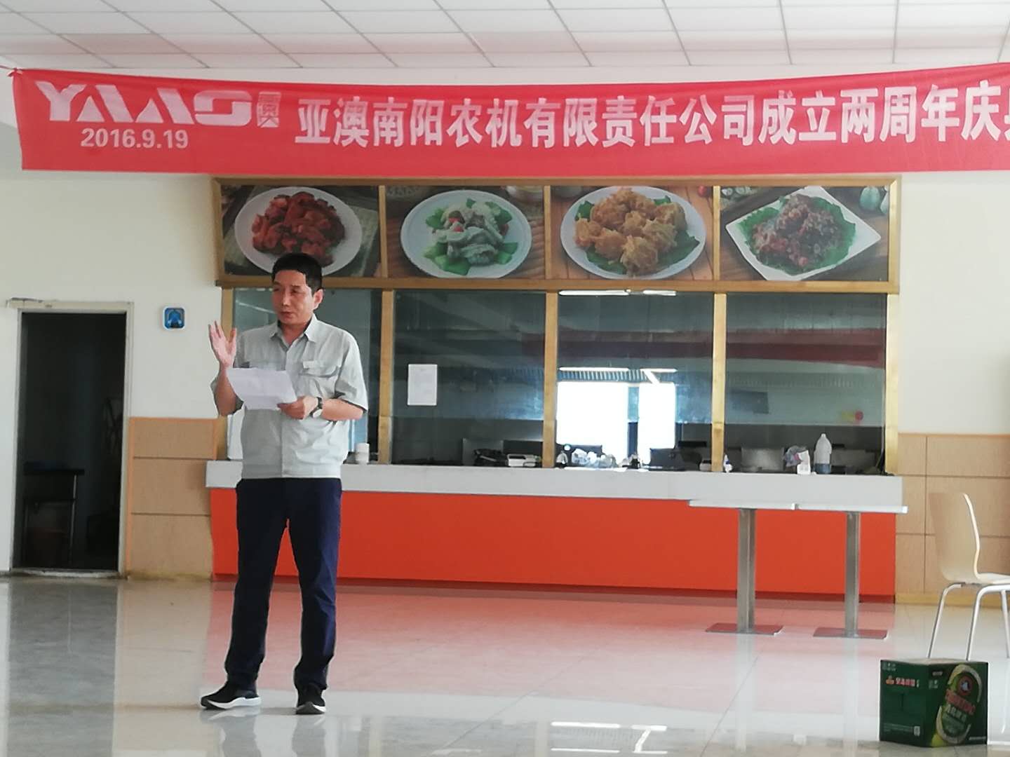 中秋佳節(jié)至,周年慶歡喜。2018年9月23日,亞澳南陽(yáng)農(nóng)機(jī)有限責(zé)任公司開(kāi)業(yè)兩周年慶典暨歡度中秋佳節(jié)活動(dòng)在公司餐廳隆重舉行,因當(dāng)天有生產(chǎn)任務(wù),在不耽誤生產(chǎn)及各部門班組的全力配合下,慶典活動(dòng)在中午12:00順利開(kāi)始。