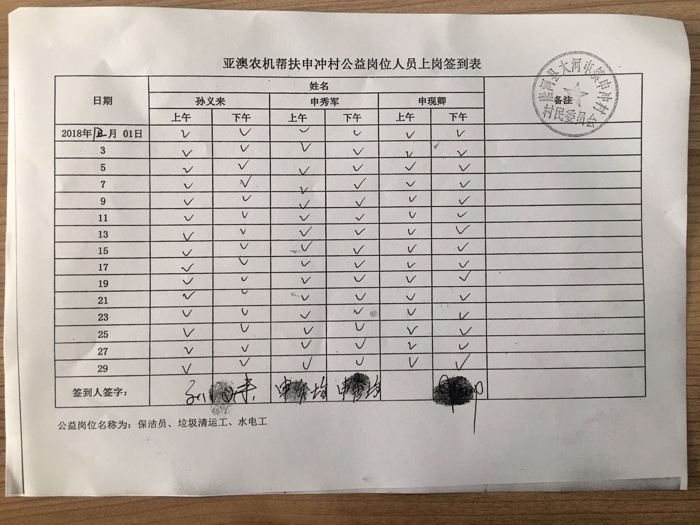 除此之外,我公司聯(lián)合村委會照顧一些特別貧困但有行動能力的老人為村部垃圾清運、水電維修、村落清潔等,并為此購買公益崗位,每月定期給這些公益崗位發(fā)放工資,以確保他們的正常生活。