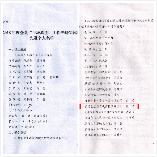 412日,唐河縣召開2018年度“三城聯(lián)創(chuàng)”總結(jié)大會。大會宣讀了表彰先進(jìn)集體及先進(jìn)個人的決定。亞澳農(nóng)機(jī)獲得2018年度國家園林縣城創(chuàng)建工作先進(jìn)集體。