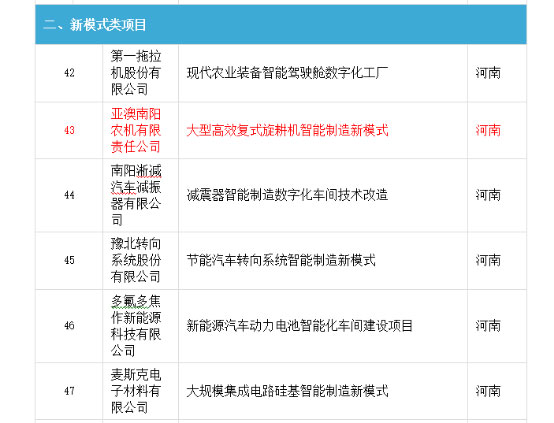 近日,亞澳農(nóng)機(jī)被國家工信部評(píng)為2017年智能制造綜合標(biāo)準(zhǔn)化與新模式應(yīng)用示范企業(yè)。據(jù)了解,這次全國智能制造綜合標(biāo)準(zhǔn)化專項(xiàng)項(xiàng)目批準(zhǔn)企業(yè)43 家,河南省內(nèi)2家,為機(jī)械工業(yè)第六設(shè)計(jì)研究院,洛陽軸研科技股份有限公司國有大型企業(yè);新模式應(yīng)用立項(xiàng)51家,河南省僅批準(zhǔn)6家,亞澳智能化制造新模式成為業(yè)界首家,并獲得國家專項(xiàng)資金補(bǔ)貼。