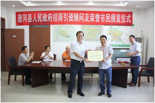 9月1日,唐河縣人民政府舉行招商引資顧問及榮譽市民頒發(fā)儀式??h長周天龍、政府副縣長王天清、縣產(chǎn)業(yè)集聚區(qū)黨工委書記王全廣等出席儀式。