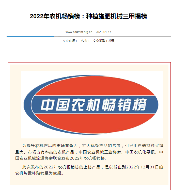 據(jù)中國(guó)農(nóng)機(jī)網(wǎng)最新消息,為提升農(nóng)機(jī)產(chǎn)品的市場(chǎng)競(jìng)爭(zhēng)力,擴(kuò)大優(yōu)秀產(chǎn)品知名度,引導(dǎo)用戶選擇購(gòu)買銷量大、市場(chǎng)占有率高的農(nóng)機(jī)產(chǎn)品,中國(guó)農(nóng)業(yè)機(jī)械工業(yè)協(xié)會(huì)、中國(guó)農(nóng)機(jī)化導(dǎo)報(bào)、中國(guó)農(nóng)業(yè)機(jī)械流通協(xié)會(huì)聯(lián)合發(fā)布2022年農(nóng)機(jī)暢銷榜。亞澳農(nóng)機(jī)進(jìn)入耕整地機(jī)械和種植施肥機(jī)械農(nóng)機(jī)暢銷雙料三甲榜。